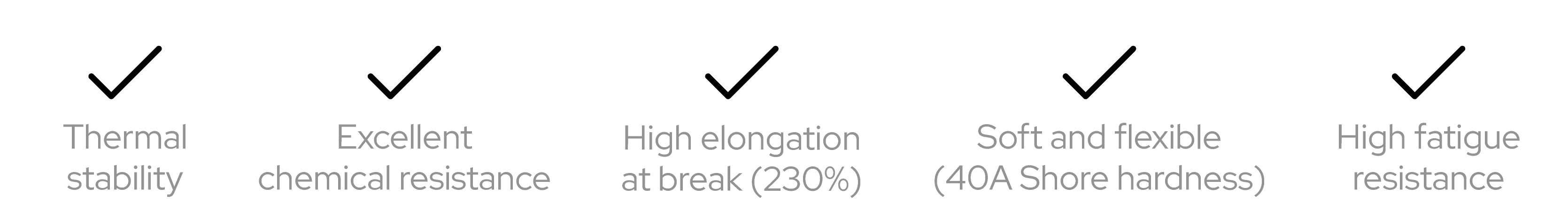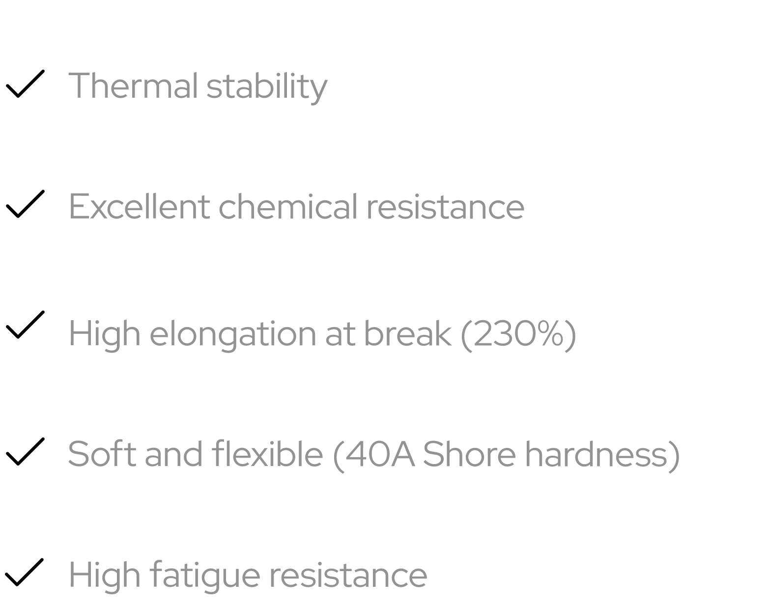 This 40A Shore durometer material enables the production of soft, flexible, and durable parts with 230% elongation at break and 12 kN/m tear strength. It withstands repeated stretching, flexing, and compression while offering excellent chemical and thermal resistance (-25°C to 125°C).